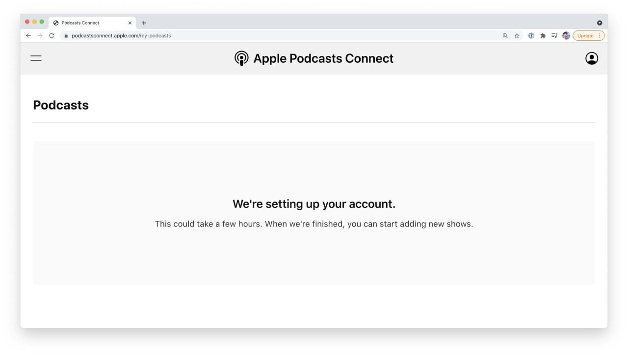 Initially, I tried logging in to the new Podcasts Connect and was greeted with screen: