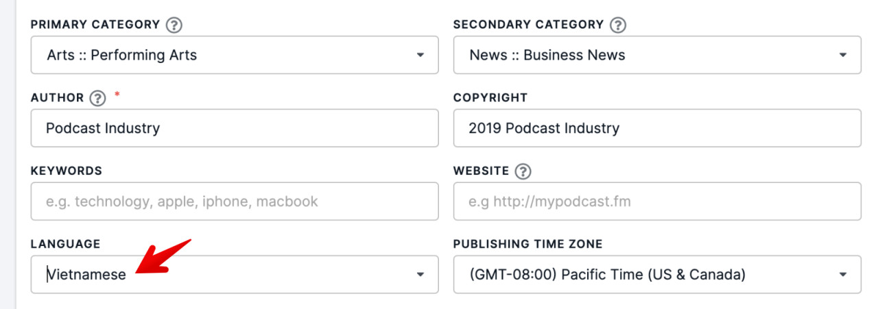 You can now identify your podcast's language as Vietnamese in your Show Settings: