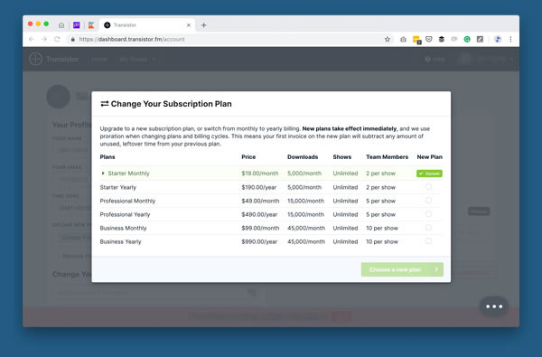 If you're a Transistor customer, you can now change your subscription plan (and download your invoices) in your account settings.