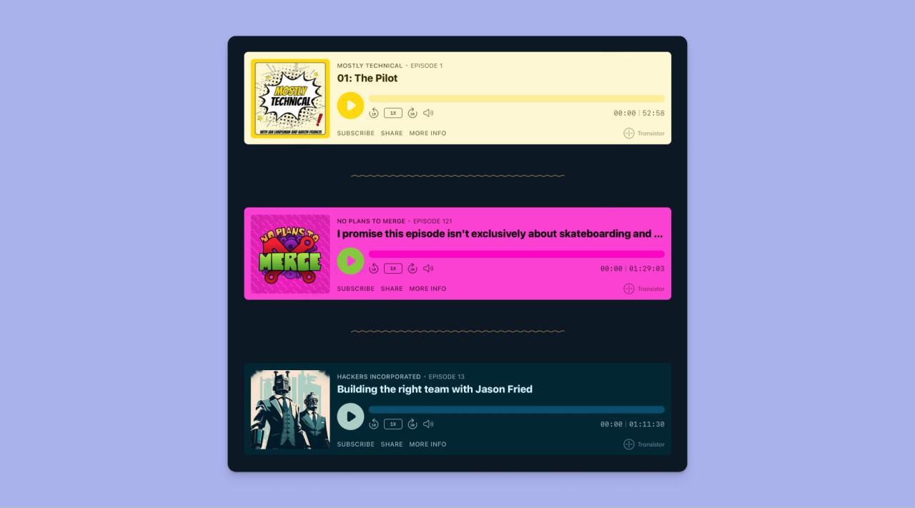 Now, in Transistor's podcast hosting dashboard, you can customize the colors for your show's embeddable players. This is especially helpful for podcasters with a website who want the embeddable podcast player to match their colors and branding.