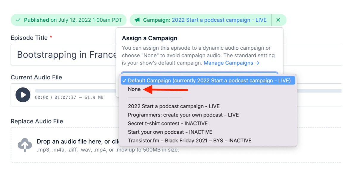 Also, if you don't want a particular episode to get assigned to a campaign, even the default, you can set the campaign in your episode settings to "None."