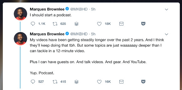 Marques Brownlee, a YouTube star with 7,645,075 subscribers, just announced his plans to start a podcast: