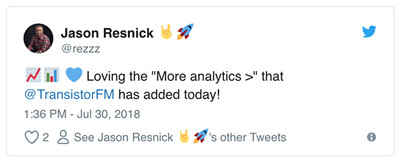 Go to "Analytics" in your Transistor account and you'll see a full array of stats: