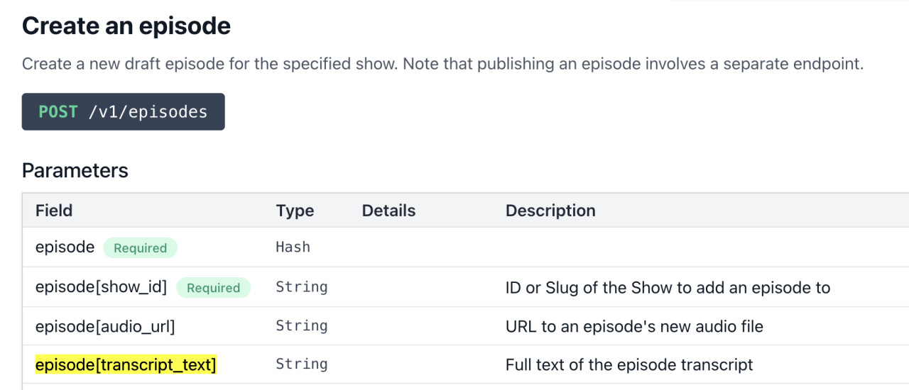 Previously episodes could be created and updated using the API but they could not include a transcript. Transcripts would need to be added afterwards directly in the application interface.