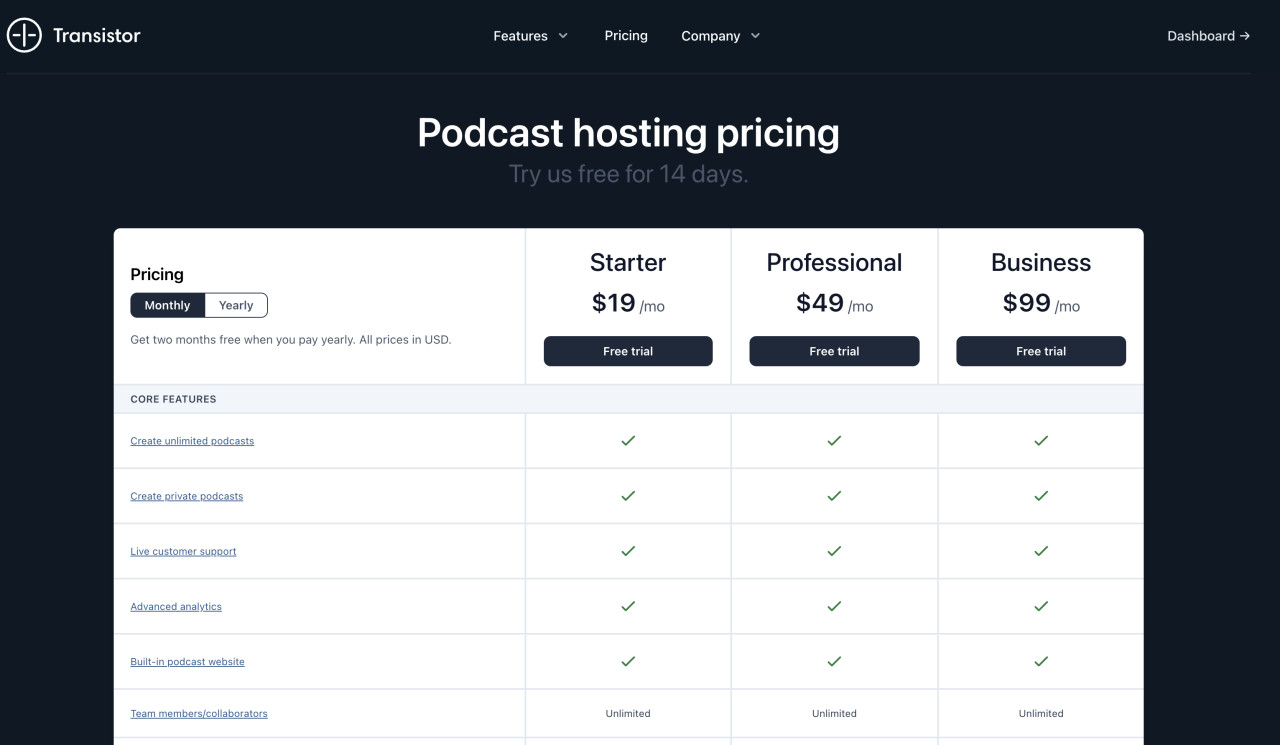 You can now have unlimited team members for all of your podcasts, regardless of the subscription plan that you are on with Transistor. You will now see that our pricing page has been updated to reflect that change.