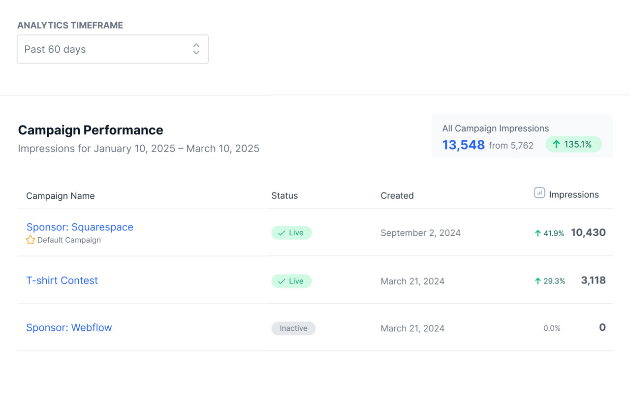 Easily track and compare your ad campaigns’ performance and impressions over different time periods, such as the last 30 or 60 days.