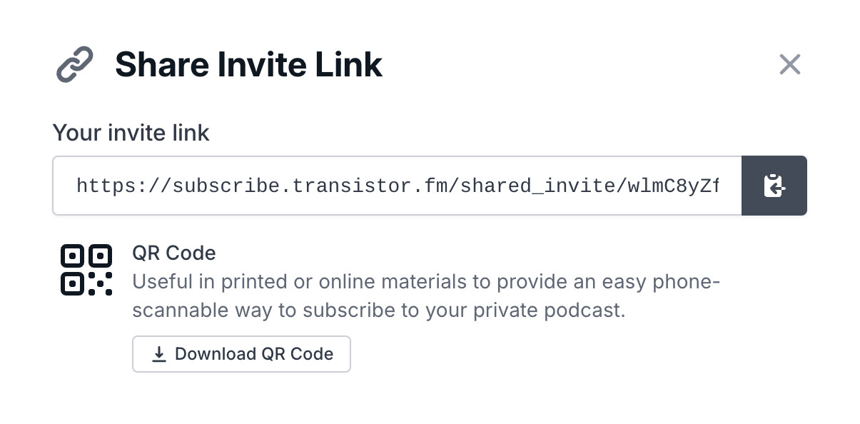 Generate a private link and QR code to invite listeners to become subscribers of your new private podcast.