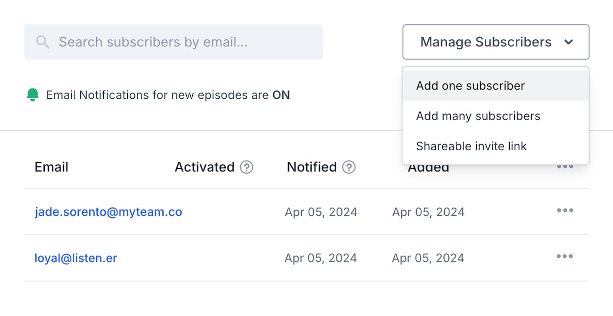 Add subscribers manually, upload a CSV, use Zapier, or send them an invite link. Each subscriber will get access to a unique RSS feed they can add to Apple Podcasts, Pocket Casts, Overcast, and more.