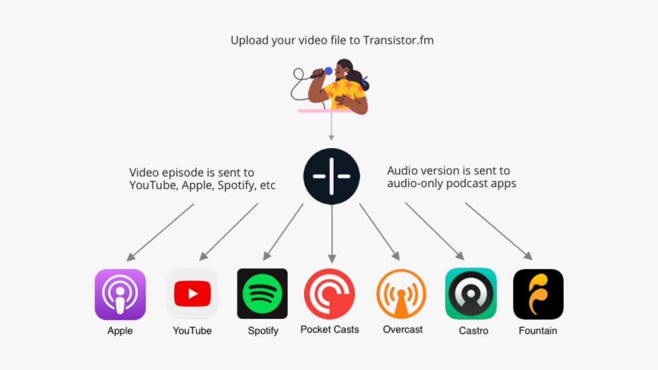 So now, modern podcast hosting platforms (like Transistor) will allow you to upload your video episode once, and have it automatically distributed to:
