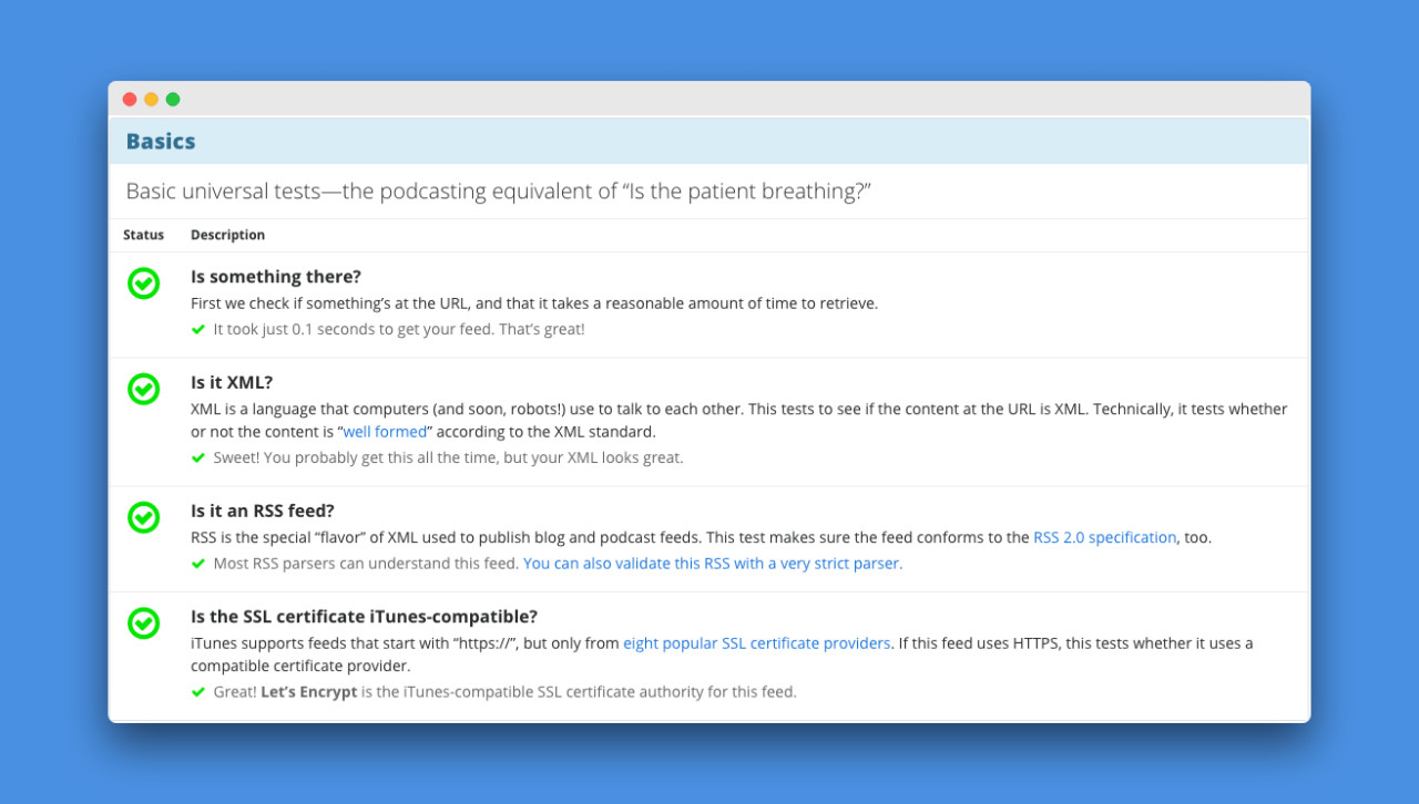 On Podbase (the podcast feed validator) Transistor's feeds get the highest score possible: